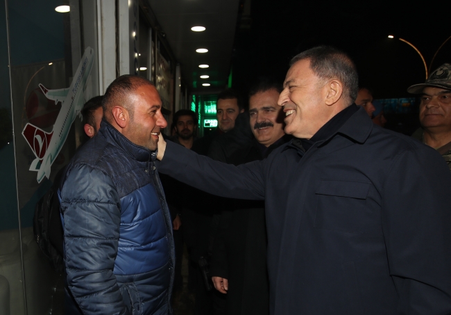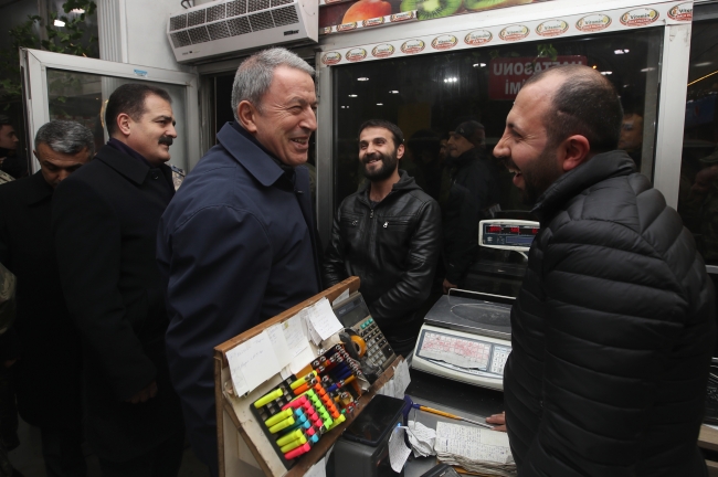 Burada, çalışmalara ilişkin bilgi alan Akar, sonrasında Orgeneral Güler, Vali Akbıyık ve beraberindekilerle ilçe merkezindeki esnafı ziyaret etti. Bakan Akar'ın ilk durağı bir taksi durağı oldu. Buradaki esnafla soba başında oturan Akar, taksicilerle bir süre sohbet etti.