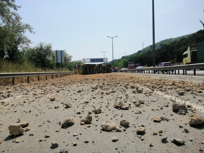 A.A. idaresindeki hafriyat kamyonu sürücüsünün direksiyon hakimiyetini kaybetmesi neticesinde kontrolden çıkarak yol kenarındaki bariyerlere çarptı. Çarpmanın şiddetiyle hafriyat kamyonu savrularak yolun ortasında devrildi. Kamyonda bulunan tonlarca hafriyat yola döküldü.