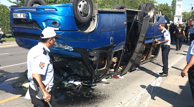 Minibüs, çarpmanın etkisiyle devrilip, ters döndü. Olay yerine gelen itfaiye ekipleri minibüsteki yaralıları çıkardı.