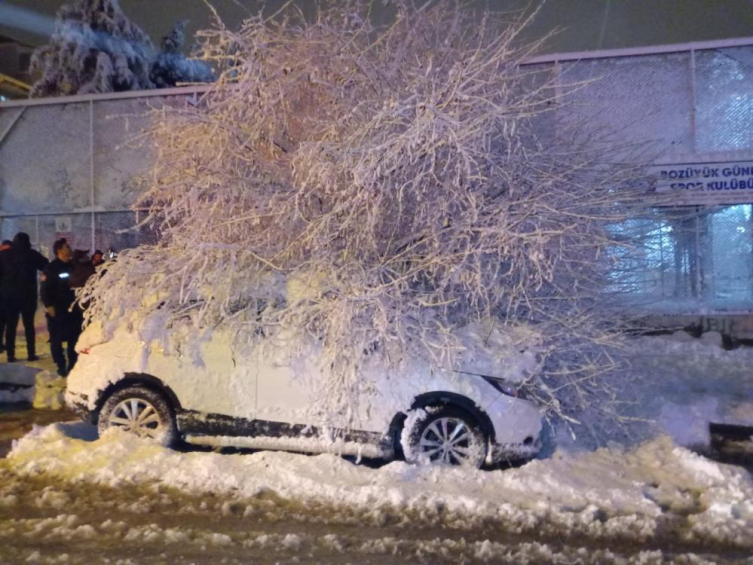 Yeni Mahalle Oral Sokak'ta yol kenarında bulunan bir ağaç, üzerinde oluşan kar birikintisi sebebiyle park halindeki otomobilin üzerine devrildi.