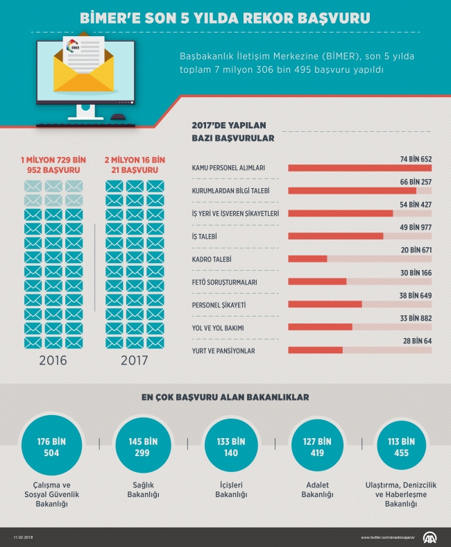 Anadolu Ajansı (AA) muhabirinin edindiği bilgiye göre, kurulduğu 2006'dan bu yana vatandaşların istek, şikayet, ihbar, görüş, öneri ve bilgi edinme haklarına ilişkin taleplerini alan, inceleyen ve ilgili makamlara ileten BİMER'e, son 5 yılda başvurular artarak devam etti.