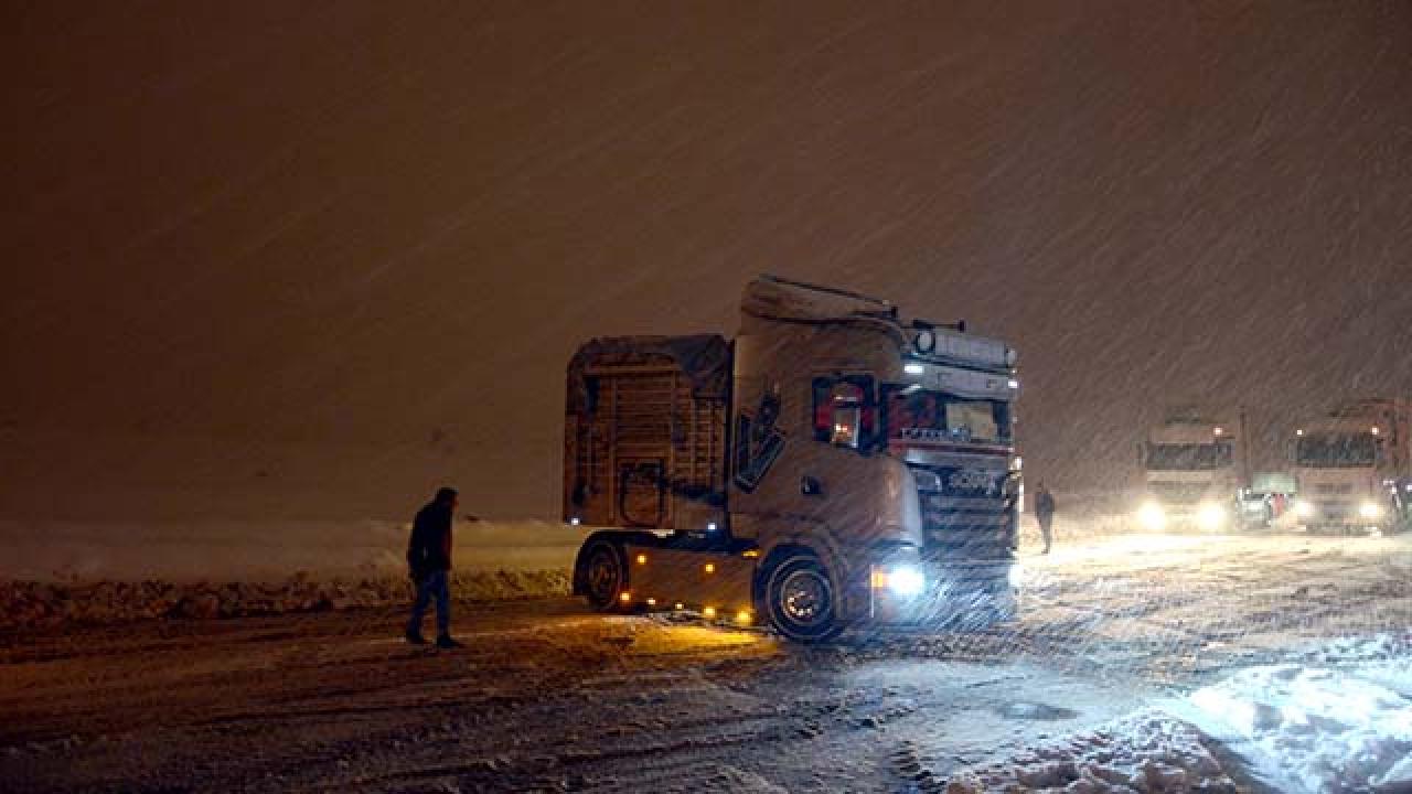 Polis ekipleri, yük taşımacılığı yapan tırları yoğun kar yağışı ve tipi nedeniyle akaryakıt istasyonları ve yol kenarlarında bekletti.