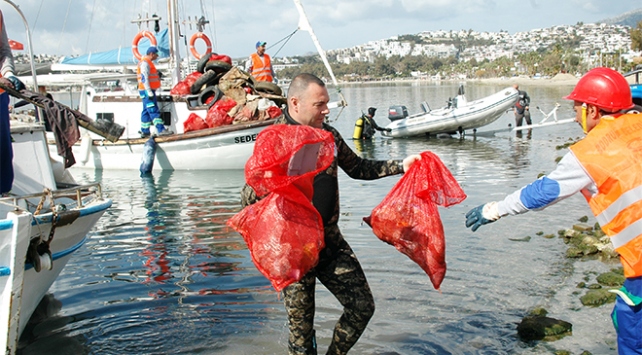 Muğla'nın Bodrum ilçesinde, belediye tarafından "Denize en çok mavi yakışır" sloganı ile gerçekleştirilen deniz dibi temizliğine öğrenciler de destek verdi.