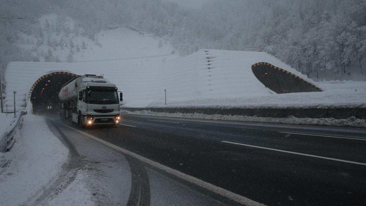 Güzergahta ilerleyen ağır tonajlı araçların, polis ekiplerince Bolu kesimi Elmalık Kavşağı'nda oluşturulan kontrol noktasından geçişine izin verilmiyor.