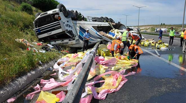Alınan bilgiye göre, Anadolu otoyolundan Ankara yönüne giden ve Ömer Bozkurt'un kullandığı 63 K 7376 plakalı sıvı yağ yüklü tır, sürücüsünün direksiyon hakimiyetini kaybetmesi sonucu Gerede Gişeleri mevkisinde yoldan çıkarak devrildi.