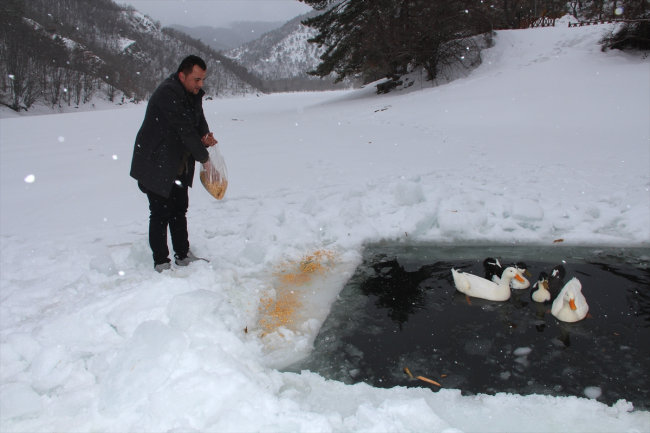 Tesiste 20 civarında ördek beslediklerini anlatan Akça, "Maalesef birkaçı telef oldu. Buz tutan göl zemini üzerinde motorlu testereyle kesim yaparak onlar için doğal yaşam alanı oluşturmaya çalıştık. Göl yüzeyinde yaklaşık 50 santimetre kalınlığında buz tabakası oluşmuş. Ördekler, oluşturduğumuz alanda suya giriyor, biz de yemlerini veriyoruz." dedi.