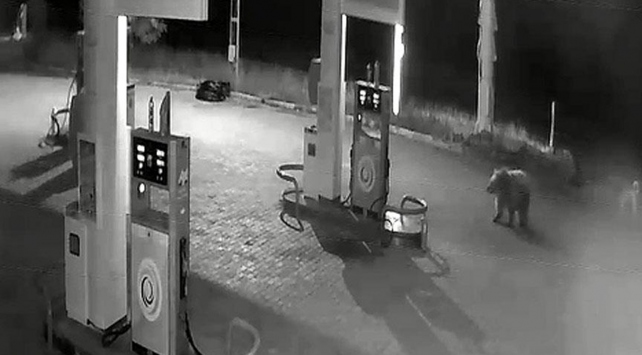 İlçe girişinde bulunan bir akaryakıt istasyonuna gece yarısı gelen boz ayı, güvenlik kamerasınca kaydedildi.