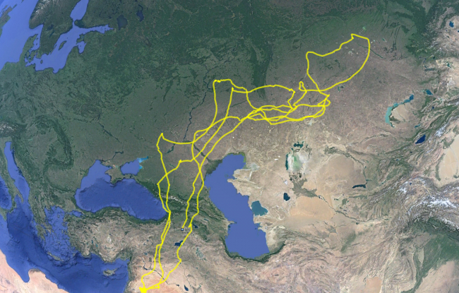 Uydu verilerinden derlenen bilgilere göre, doğal ortamına salınan kuş aynı yıl sırasıyla Ermenistan, Gürcistan ve Rusya'dan geçip Kazakistan'a yerleşerek yazı burada geçirdi.