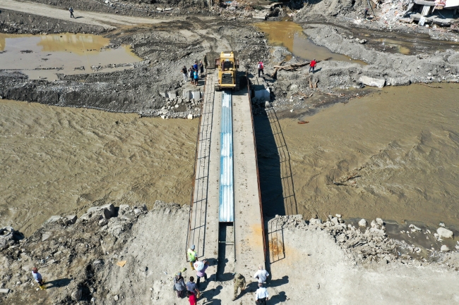 [Fotoğraf: AA]Ayrıca, sel nedeniyle ilçede yıkılan köprünün yerine yerleştirilen beton blokların üzerinde zemin düzeltme aşamasına geçildi. Zeminin düzeltilmesiyle birlikte köprü yeniden kullanıma açılacak.