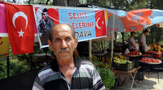 "Şehit yakını değilim. Vatanımızı ve milletimizi korurken hayatını kaybeden şehitlerimizi çok seviyorum. Onların anısına şehit aileleri ve gaziler, manavımdaki tüm ürünlerden istedikleri kadar alabilirler. Teraziye koymadan gönül rahatlığıyla evlerine götürebilirler. Hiçbir beklentim yok. Tamamıyla alın terim, helal olsun. İstedikleri kadar alabilirler."