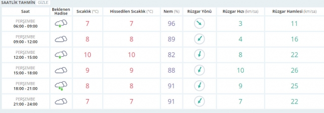 Çok bulutlu ve yağmurlu geçeceği tahmin ediliyor. Bölgenin kuzeydoğusunda sabah saatlerinde buzlanma ve don olayı ile birlikte yer yer sis ve pus hadisesi bekleniyor.