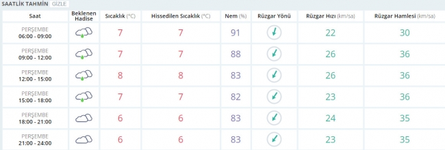 Parçalı bulutlu geçeceği tahmin ediliyor. Gece ve sabah saatlerinde yer yer sis ve pus hadisesi ile birlikte doğu kesimlerde buzlanma ve don olayı bekleniyor.