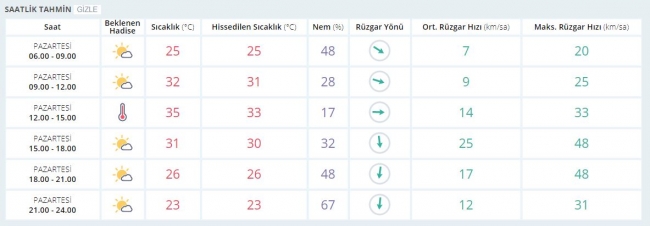 Az bulutlu ve açık geçeceği tahmin ediliyor. Rüzgarın Kuzey ve Kıyı Ege'de kuzeyli yönlerden yer yer kuvvetli olarak (30-50 k m/saat) esmesi bekleniyor.