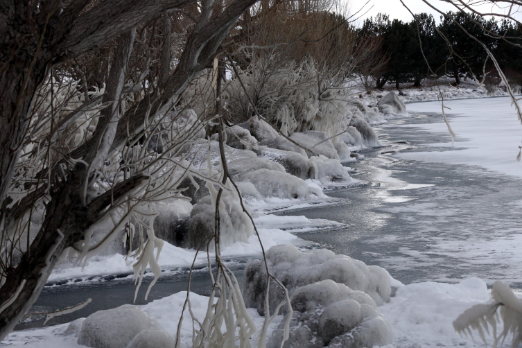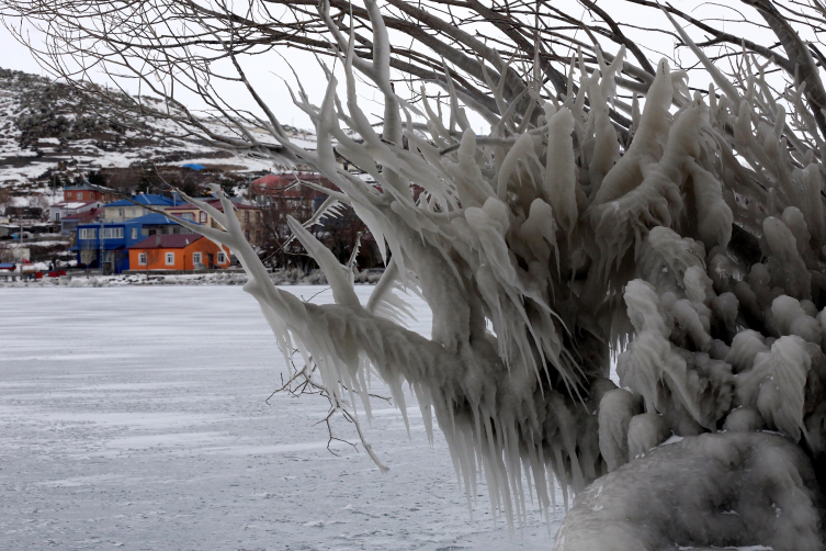 Kıyıdaki ağaçlar, bitkiler ile bir işletmeye ait çardaklar, sandalyeler, masalar ve teknelerin tamamen buz tuttuğu bölgedeki kış manzarası, kutupları andırıyor.