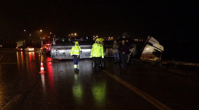 İstanbul-Bursa-İzmir karayolu Görükle ayrımında, sabun yapımında kullanılan kostik kimyasalı yüklü 55 LF 064 plakalı tankerin sürücüsü Bilal K. yağmurdan dolayı kayganlaşan yolda direksiyon hakimiyetini kaybederek yolda yan yattı.