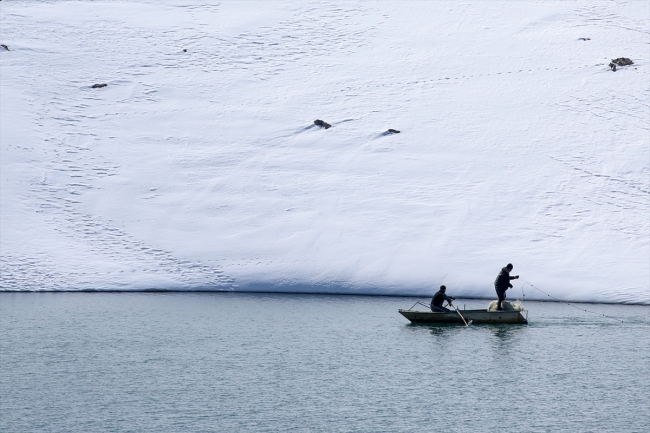 Baharla birlikte gölün buz tabakası eriyen kısımlarında avlanan balıkçılar, yakaladıkları sazan ve alabalıkları satarak geçimlerini sağlıyor.