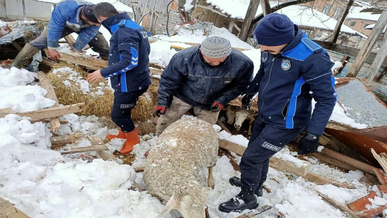 Ahırda bulunan 15 koyun ile 1 kuzu göçük altında kaldı.