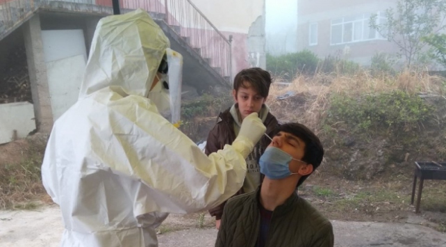 Yeterli sayıda oluşturulan ekipler, sağlık taramasından geçirilen bu kişiler arasında gerekli görülenlerden Covid-19 testi yapılmak üzere numune alıyor.