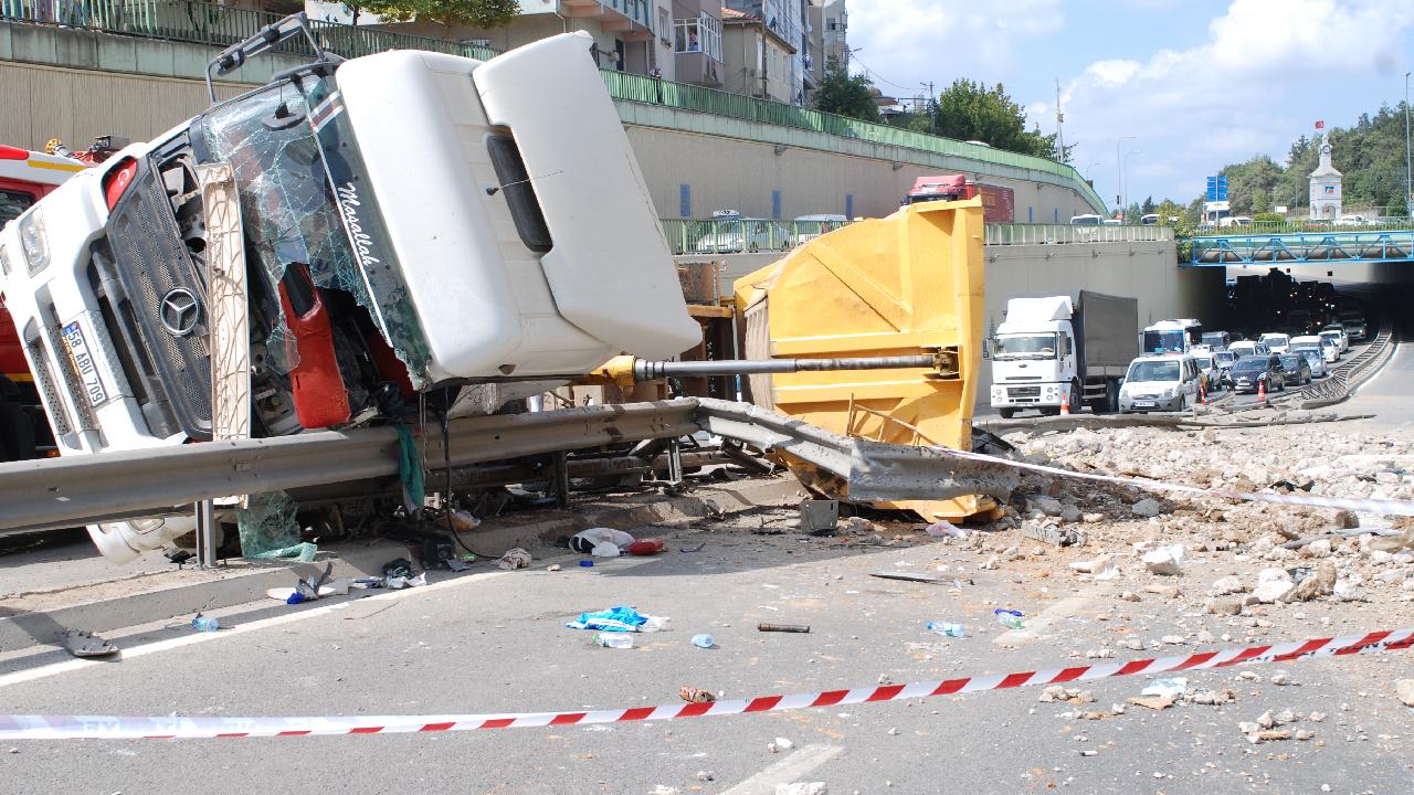 Çekmeköy'de Şile istikametine seyir halindeki Hüseyin Öztürk idaresinde inşaat molozu yüklü hafriyat kamyonu, Taşdelen mevkisinde lastiğinin patlaması sonucu refüjdeki bariyerlere çarparak devrildi.