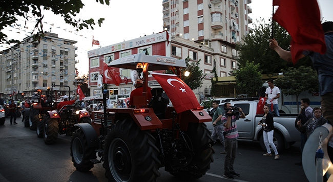 Adana çiftçiler, Türk Bayrağı astıkları traktörleriyle konvoy düzenleyerek, Fetullahçı Terör Örgütü'nün (FETÖ) darbe girişimine tepki gösterdi.