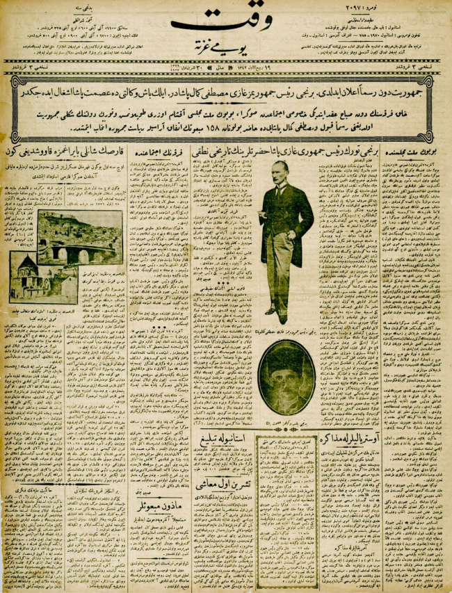 [Vakit Gazetesi. Cumhuriyet dün resmen ilan edildi. Birinci Reis-i Cumhurumuz Gazi Mustafa Kemal Paşa'dır. İlk baş vekaleti de İsmet Paşa işgal edecektir.]