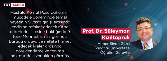 “Burada Mustafa Kemal Paşa'nın büyük bir önderliği, liderliği söz konusudur. Mustafa Kemal Paşa daha milli mücadele döneminde temsil heyetinin Sivas'a gidişi sırasında kendisine refakat edecek rütbeli askerlerin listesine baktığında 9 tane Mehmet ismini görmüş. Burada orduya ve millete hizmet edecek kişiler arasında görevlendirme ve tanıma noktasındaki zorlukları görmüş. İsim benzerliklerinden doğacak vahim hataların milli mücadeleyi daha başından etkileyeceğini düşünmüş.”