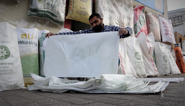 Tahıl pazarında ikinci el çuval alım satımı yapan esnaf, kullanılmış un, buğday, bakliyat, şeker ve yem çuvallarını çöpe gitmekten kurtarıp ekonomiye kazandırıyor.
