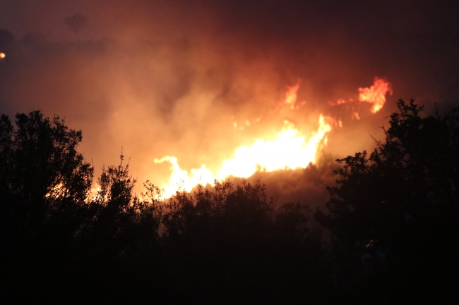Ekiplerin çalışmalarına mahalle sakinleri de destek veriyor. Bölgede bir yangın söndürme uçağı da havadan alevlere müdahale etti.