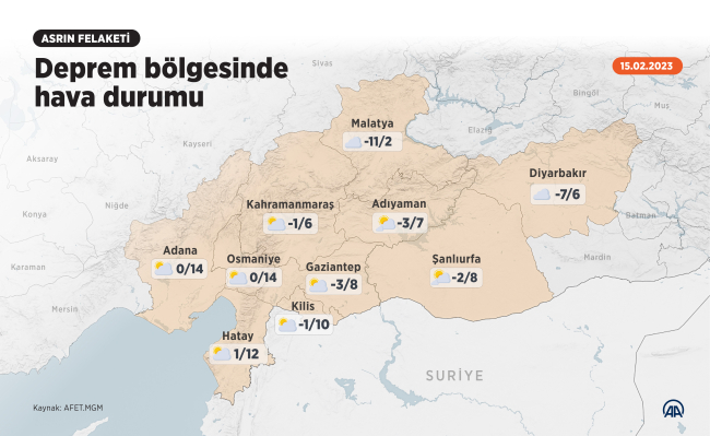 Osmaniye'de ise hava sıcaklığının bugün ve yarın en düşük 0, en yüksek 14, cuma günü en düşük 2, en yüksek 14 derece, cumartesi günü ise en düşük 3, en yüksek 15 derece olması bekleniyor.