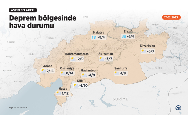 Adana'da ise hava sıcaklıklarının bugün en düşük 2, en yüksek 15 derece olması bekleniyor.