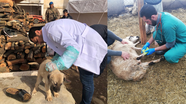 Elazığ'ın Sivrice ilçesi Çevrimtaş köyünde, gönüllü veteriner hekimler ve Jandarma Özel Harekata bağlı askerler depremden zarar gören hayvanlara zorlu kış ve gece koşullarına rağmen sağlık hizmeti götürdü.