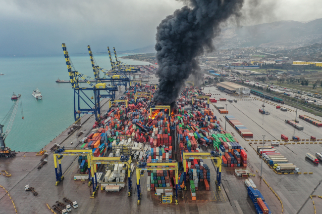 İskenderun Limanı'nda sarsıntıda devrilen konteynerlerde yangın çıktı. İtfaiye müdahale etti.