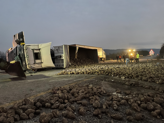 Kaza sonrası tırın kasasındaki pancarlar kara yoluna saçıldı. Polis ekiplerinin önlem almasının ardından pancarlar iş makineleriyle yol kenarına taşındı.