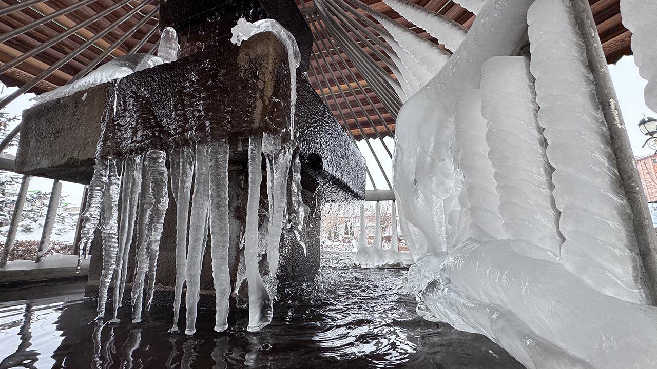 Binaların çatılarında da buz sarkıtlarının oluştuğu şehirde soğuk nedeniyle bazı camilerin bahçelerindeki şadırvanlar buzla kaplandı.