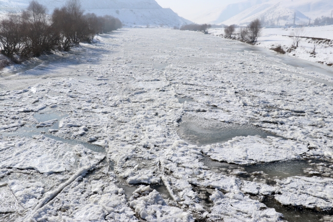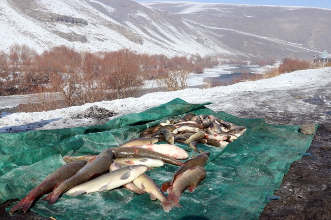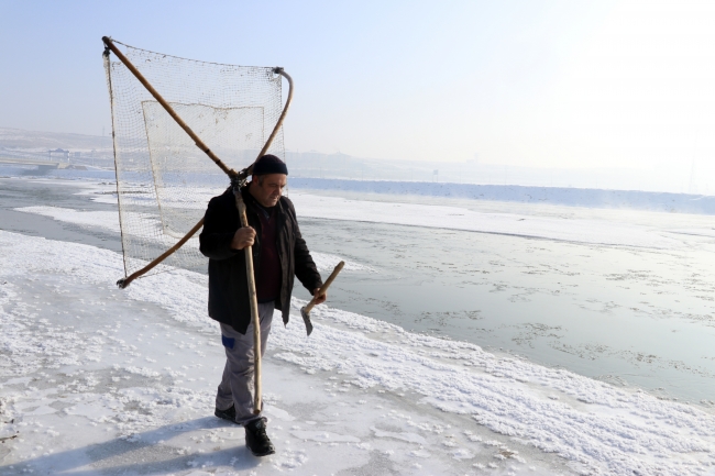 Yaz aylarında farklı işlerde çalışarak ailelerinin geçimini sağlayan vatandaşlar dondurucu soğukların ardından yüzeyi buz tutmaya başlayan Murat Nehri'nde balık avına başladı.