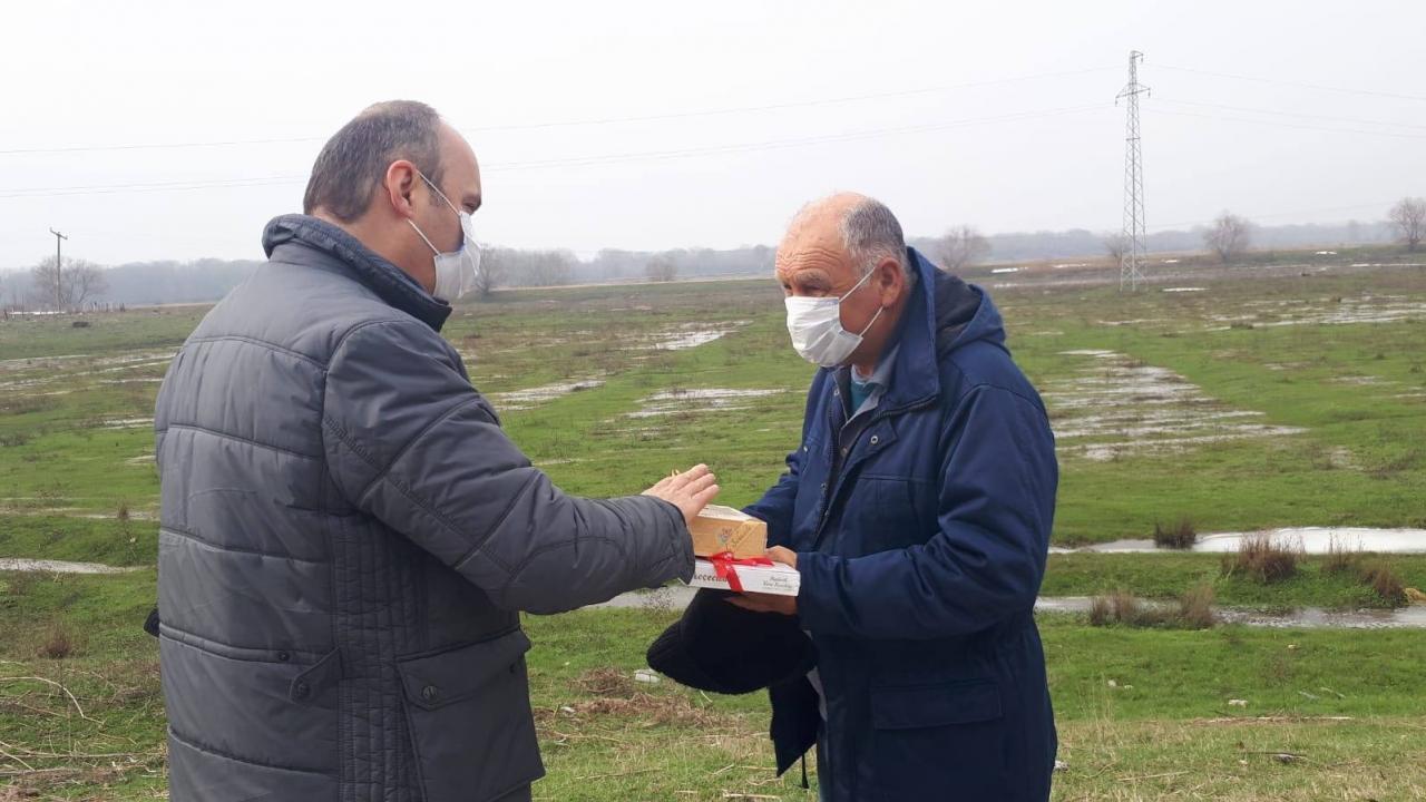 Ziyaretleri sırasında Elçili köyü merasında maskesiyle koyun otlatan köy sakini Ersin Öner'i görünce mola veren Vali Canalp, vatandaşla sohbet etti.