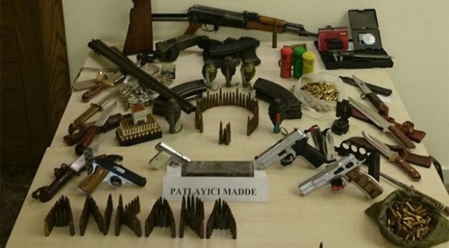 Evde yapılan aramada 1 kalaşnikof tüfek, 1 kalıp dinamit, 5 el bombası, 3 sis bombası, biri ruhsatsız 4 tabanca, aralarında uçaksavar ve ağır silah mühimmatının da olduğu 805 adet farklı çap ve markada mermi, 15 komando bıçağı, 1 lazer noktalayıcı, 1 elektronik mesafe ölçer, 3 elektronik nesne ölçer ve 1 askeri telefon ele geçirildi.