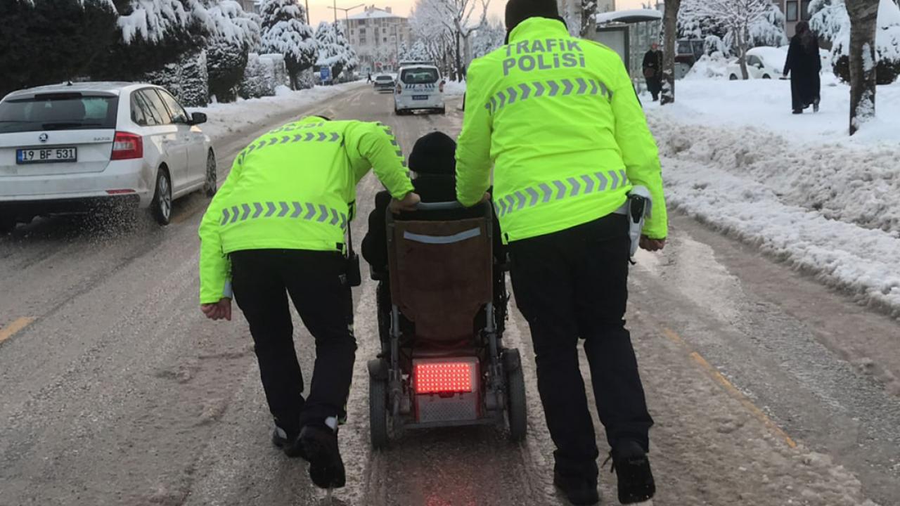 Kaldırımda biriken karlar nedeniyle evine gidemeyen engelli İsmet Yılmaz’ı gören trafik polisleri yardıma koştu.
