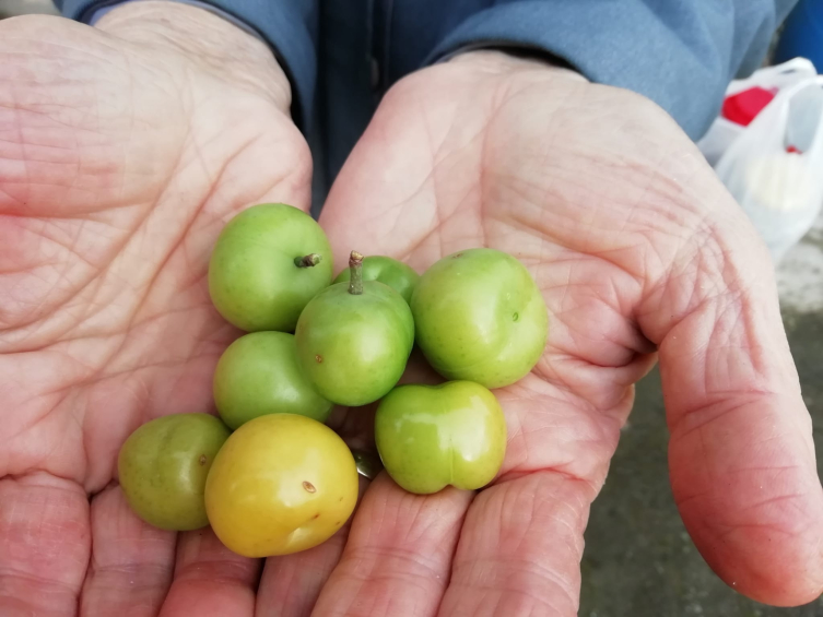 Sıcaklıkların mevsim normallerinin üzerinde seyrettiği ilçede yaşayan Halit Dinç, bahçesindeki erik ağacının meyve verdiğini fark etti. Dinç, ağaçtan topladığı 8 eriği torunlarına ikram etti.