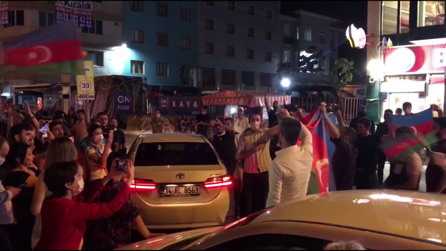 Ellerinde Azerbaycan ve Türk bayrakları taşıyan gruptakiler, daha sonda iki ülke milli marşlarını okudu.