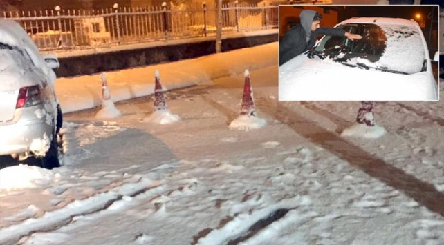 Ağrı'nın Eleşkirt ilçesinde günboyu etkili olan sağanak, akşam saatlerinde yerini kar yağışına bıraktı. Etkili kar yağışı nedeniyle araçların üzeri karla kaplandı.