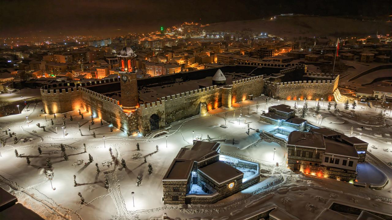Tarihi Çifte Minareli Medrese, Erzurum Kalesi, Yakutiye Medresesi ve Tepsi Minareli Saat Kulesi ile çevresi beyaz örtüyle kaplandı.