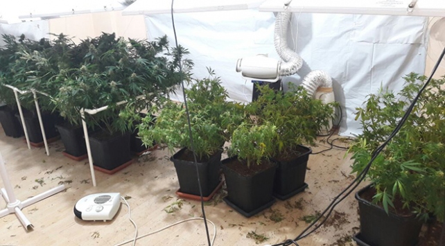Özel eğitimli köpekle evde yapılan aramada 11 gram kenevir tohumu, 896 gram esrar ile çatı kısmında ekili vaziyette 378 kök Hint keneviri ele geçirildi.