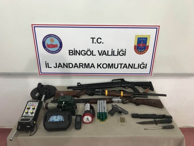 6 şüphelinin gözaltına alındığı operasyonda 1 ruhsatsız tabanca, 3 yivsiz av tüfeği, 2 dedektör, 1'er kama ve el feneri ele geçirildi.