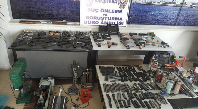 Karşıyaka ilçesinde düzenlenen operasyonda, evinin çatısında kurduğu atölyede kurusıkı tabancaları normal tabancaya dönüştürdüğü belirlenen A.A. gözaltına alındı.