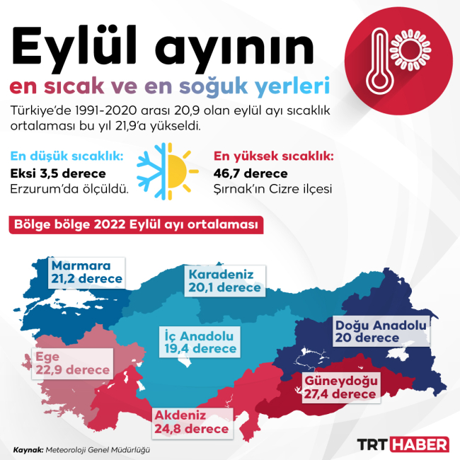 Türkiye genelinde,1991-2020 yılları arasında 20,9 derece olarak ölçülen eylül ayı ortalama sıcaklığı, bu yılın eylül ayında 21,9 derece olarak kaydedildi.
