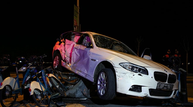 [Fotoğraf: AA]Kazada bir otomobil devrilirken diğer otomobil de belediyenin Akıllı Bisiklet Paylaşım Sistemi (İSBIKE) park alanındaki bisikletlerin üzerine uçtu. İki kişinin araçta sıkıştığı zincirleme kazada 6 kişi yaralandı.