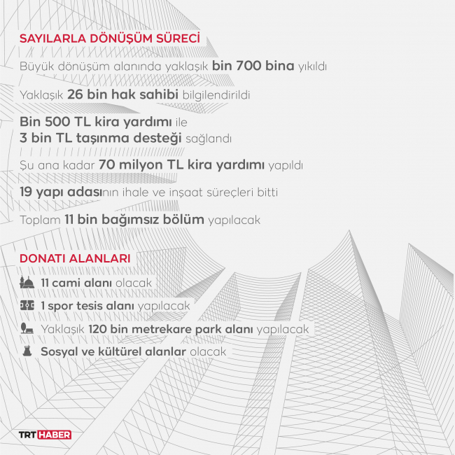 Tahliyeler verilen süre içerisinde hak sahiplerinin de desteği ile herhangi bir sorun yaşanmadan tamamlandı ve yıkım süreçleri 1 ay gibi rekor bir sürede tamamlandı. Büyük Dönüşüm alanında 19 yapı adasının ihale ve inşaat süreçleri tamamlandı.