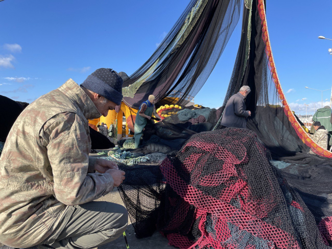 [Fotoğraf: AA]Balıkçı Ziver Aydın, bölgedeki hava şartlarının son günlerde avcılık yapmayı zorlaştırdığını belirterek, "Rüzgar zaman zaman çok sert esiyor. Buna rağmen elimizden geldiğince avcılık yapmaya devam ediyoruz. Meteorolojinin uyarısı üzerine biz de burada mola verdik. Yıpranan ağlarımız vardı, onları onarıyoruz" dedi.