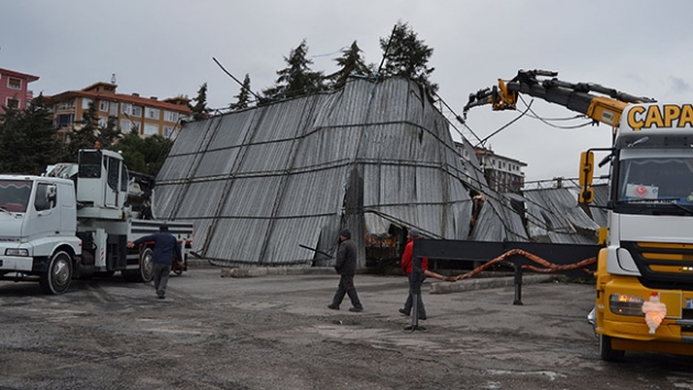 Bazı midibüslere de zarar veren saç çatı, Balıkesir İtfaiyesi ekipleri ve vinçlerin yardımı ile düştüğü yerden kaldırıldı.